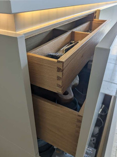 We also visited a job we completed earlier this year to tinker with a few inevitable snags. This kitchen was a modified version of our Pure Linear range, which we first started making for a housing developer in Bath back in 2012. They opted for a lower level plinth, oak drawers throughout and a mix of ultra modern and traditional doors. I didn't quite believe that the customers had been using the kitchen as it was in such showroom like condition! We loved all the finishing decor touches which really brought the area to life. Additionally, they added "Alexa" controlled lighting to the underside of the worktops. The colour used was Neptune Driftwood.